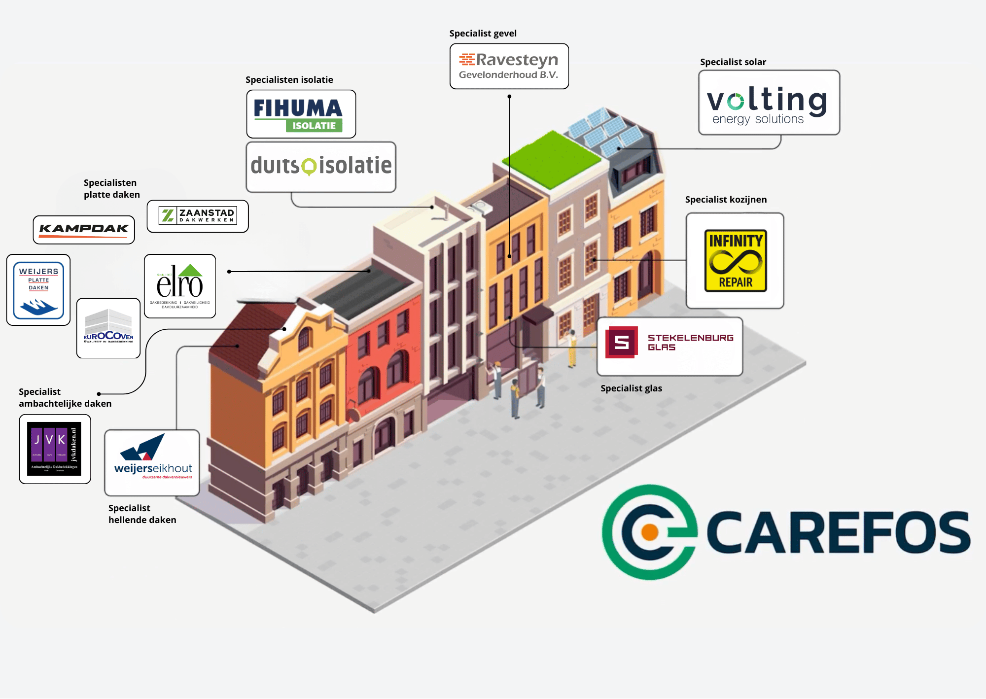 Carefos is de specialist voor het onderhoud en de renovatie van de buitenschil van gebouwen. Carefos bundelt de krachten van specialistische bedrijven en kan zo een breed dienstenprogramma van hoog niveau aanbieden. Hieronder de bedrijven die gezamenlijk Carefos vormen.